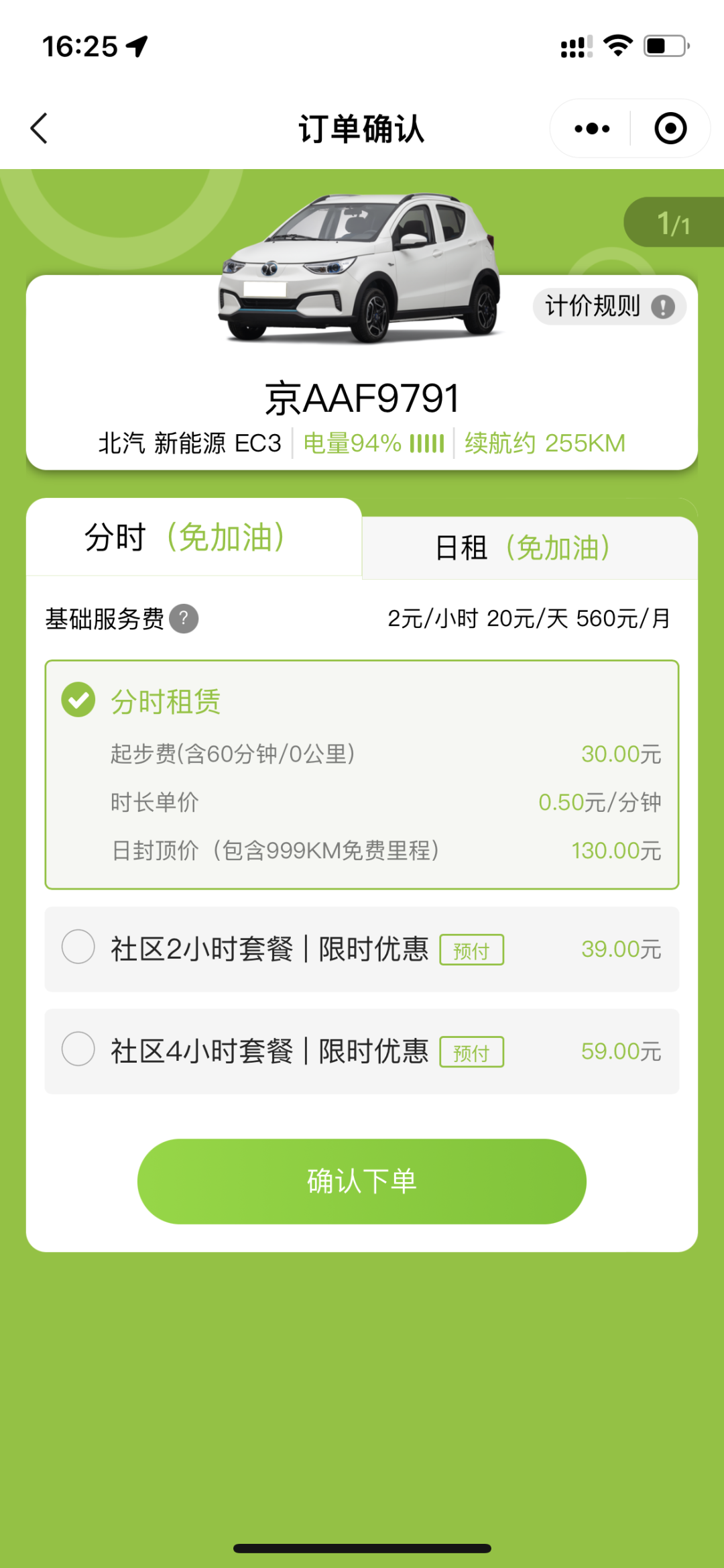 完成注册后,下单时需选择“分时租赁”,结算时即可抵扣相应时长用车租金啦~